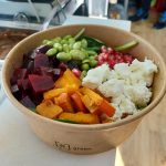 mit Couscous, Edamame, Granatapfel, marinierter Kürbis, rote Beete, Fetakäse, Blattspinat und Honig-Senf Dressing oder Balsamico Dressing.
